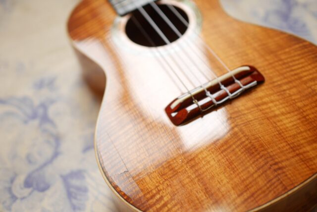 途中ピックアップも付けたいと連絡がありましたので分解のついでに Aloha Twin を事前に貼り付けてから裏板を戻します。またコマ裏の位置もコンサートからテナー用に貼り直しました。あとはテナーネックとテナー指板、ブリッジもテナー用(少しサイズを縮めて)を貼り付けました。最後に塗装をして仕上げます。それにしてもこの頃のハワイアンコアは杢がすごい!今より半値以下で手に入った時代なので、惜しげもなくこれだけのカーリーコアを使っていたんですね。