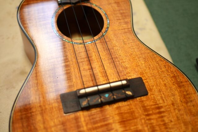 艶有り塗装の場合、部分塗装でももちろん綺麗に仕上げることができるのですが、たまに木地の色合いが変わってしまうことがあるので、全面塗装の方がおすすめ。特にこのテナーはまだほとんど傷がなくとても綺麗な状態を保っていたので、全面塗装で仕上げれば新品同様にいきます。弦高が3mm超えと少し高かったので、弦高調整でサドルを少し削りました。ついでに僅かですがピッチ調整も行いました。