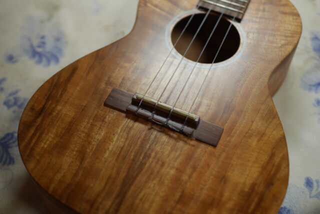 マーチンウクレレの艶消し再塗装。ご自分でDIY塗装を施こされたものの、うまくできなかったということで表板のみの艶消し再塗装修理です。今回のマーチンはハワイアンコアなので着色が無くその点は良かったです。塗膜面にところどころゴミ滓が付着しており、部分的に色ムラにもなっているので、これを治します。艶消しはそれなりの塗装設備が無いと無理なので、ちゃんと吹き付け塗装で仕上げます。