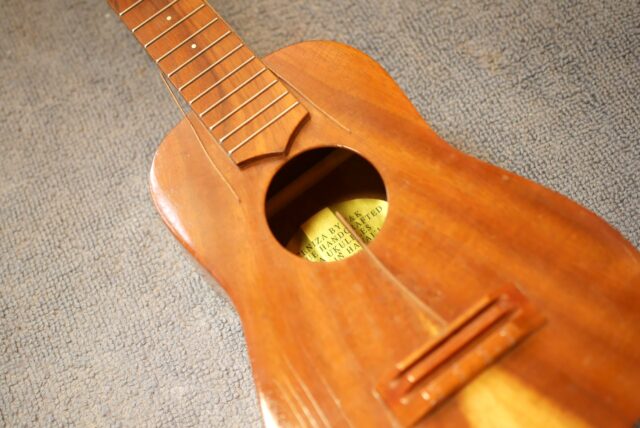 全面にウェザーチェックがびっしりと入ったハワイアンコアトップの表割れ修理。指板横両側とサウンドホール下にも1箇所入っており、すべての割れが埋木必須の乾燥割れ。ウェザーチェックが入るということは木が動いているということなので、乾燥不十分や環境問題で入った乾燥割れだと思われます。3箇所全てに溝を掘り、そこに色合わせしたハワイアンコアの薄板を埋め込みました。またフレットバリもかなり出ていたのでそれも一緒に取りました。かなり乾燥状態に置かれていたと推察されます。