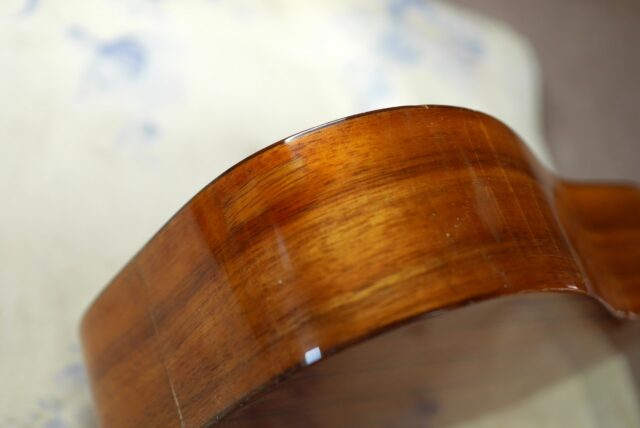 割れは基本的に中から補強する必要がありますが、このウクレレは割れた箇所が箇所だけに補強ができない。サウンドホールから一番奥の部分だし、カーブしているしでこれでは補強を貼り付けられません。なので発想の転換ということで中から貼れないなら、外から貼ってしまおうと。コア材の薄板を作って補強の意味と割れ隠しの意味も含め、その部分に貼り付けました。微妙に色は合わないので良く見ればわかってしまいますが、でも言われなければ気がつかないレベル。最終的には塗装まで行い平らにしたので一応綺麗には治りました。